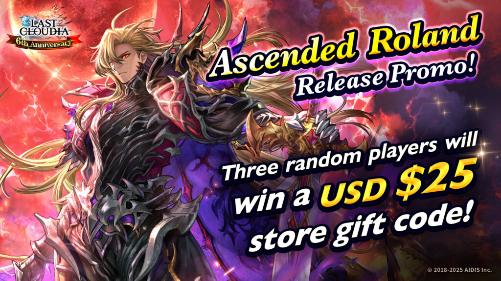 Last Cloudia will be hosting a special promotion to celebrate the release of the new unit Ascended Roland! Three (3) randomly selected players will win a USD $25 store gift code.