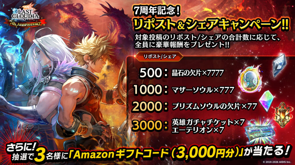 3000 リポスト/シェア:英雄ガチャチケット×7、エーテリオン×7